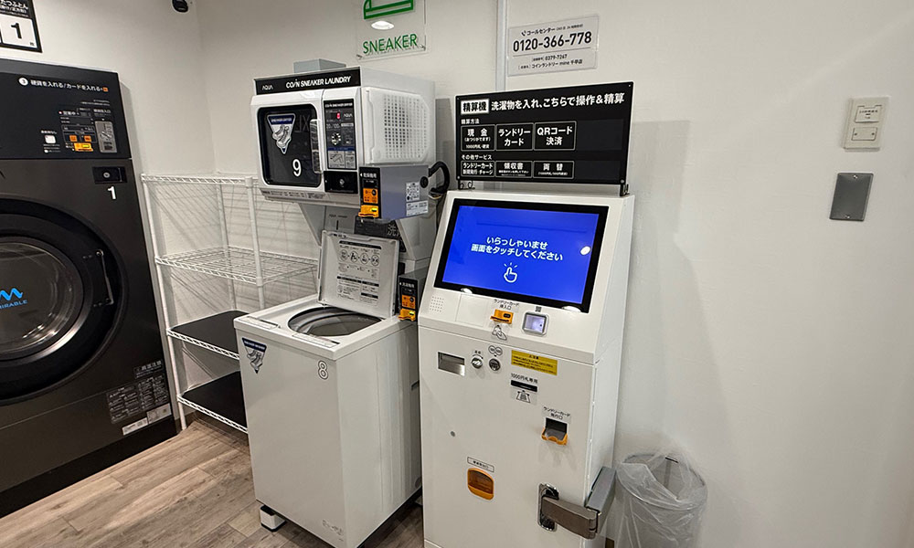 洗濯乾燥機16㎏ 2台 洗濯乾燥機10㎏ 2台 乾燥機15㎏ 1口 乾燥機14㎏ 8口 洗濯機10㎏ 1台 スニーカーランドリー マルチ端末(両替可・QRコード決済可・ランドリーカード販売) |